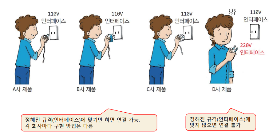 여기서 인터페이스는 서로 다른 하드웨어 장치들이 상호 데이터를 주고받을 수 있는 규격을 의미한다.