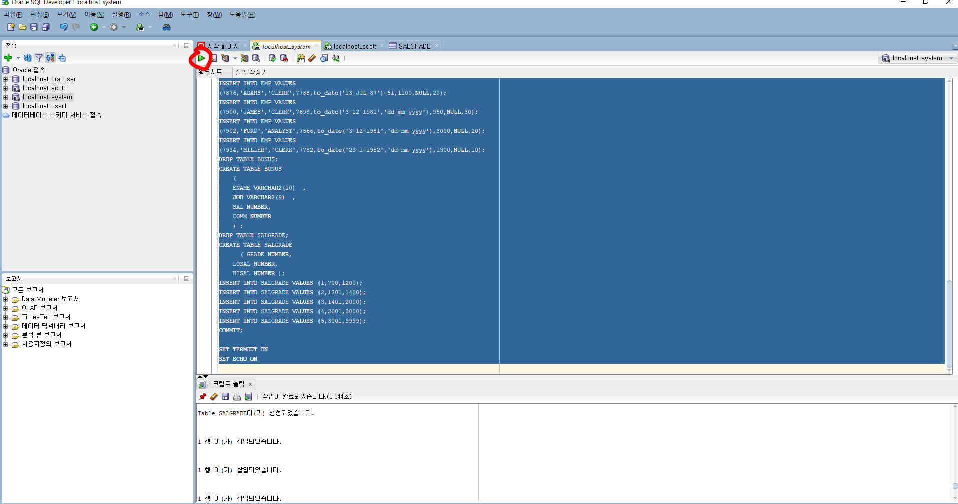 system 계정에 scott 코드를 붙여넣기 한 후 좌측 상단 실행버튼 클릭 !