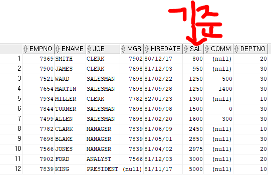 order by sal asc; -- sal을 기준으로 모든 테이블을 정렬 ! asc 생략가능 (기본값)