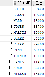 select ename, sal*12 as 연봉 from emp; -- sal*12값을 출력 이름은 연봉 으로