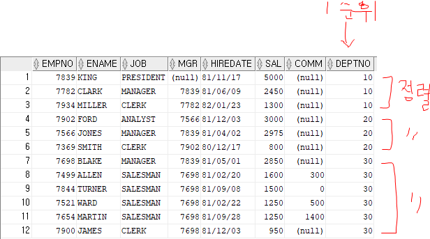 -- deptno부터 오름차순(1순위) , sal을 deptno 값 기준으로 내림차순(2순위)