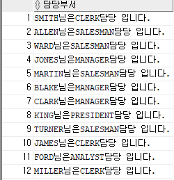 select ename || '님은' || job || '담당 입니다.' as 담당부서 from emp; -- 이런식으로도 가능!