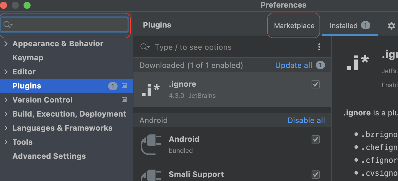 2) Marketplace 선택 > .ignore 설치 > 재시작