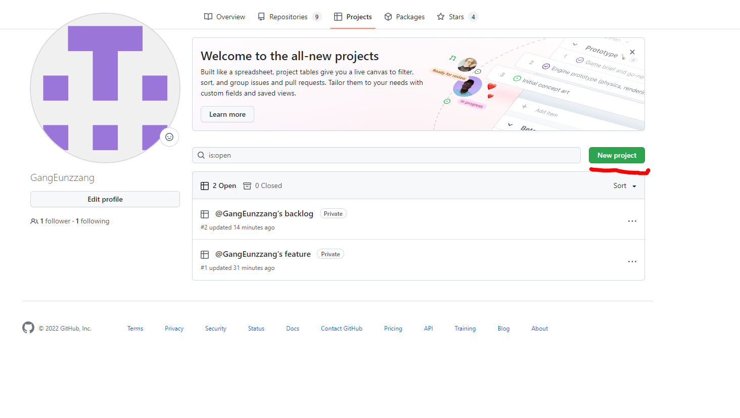 1. 생성한 Repository의 Projects - New Projcet 클릭