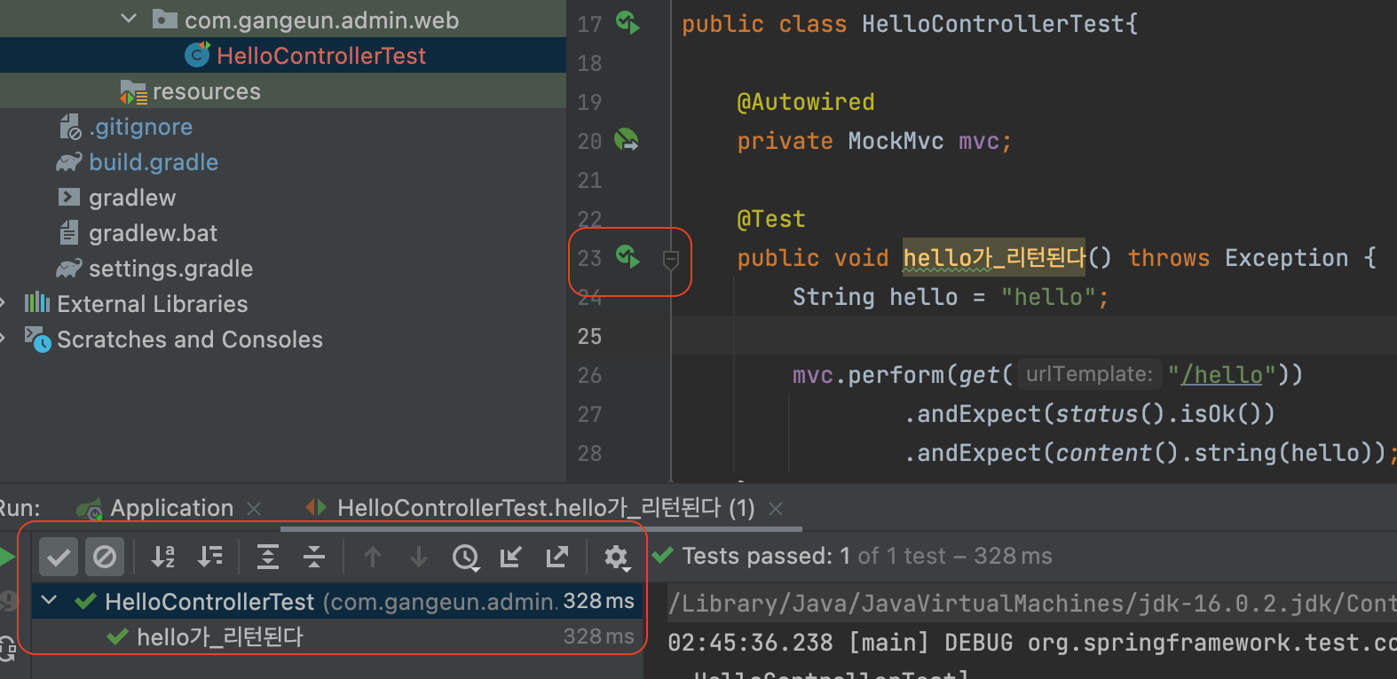 -> Controller에서 "hello"를 리턴하기 때문에 이 값이 맞는지 검증한다.