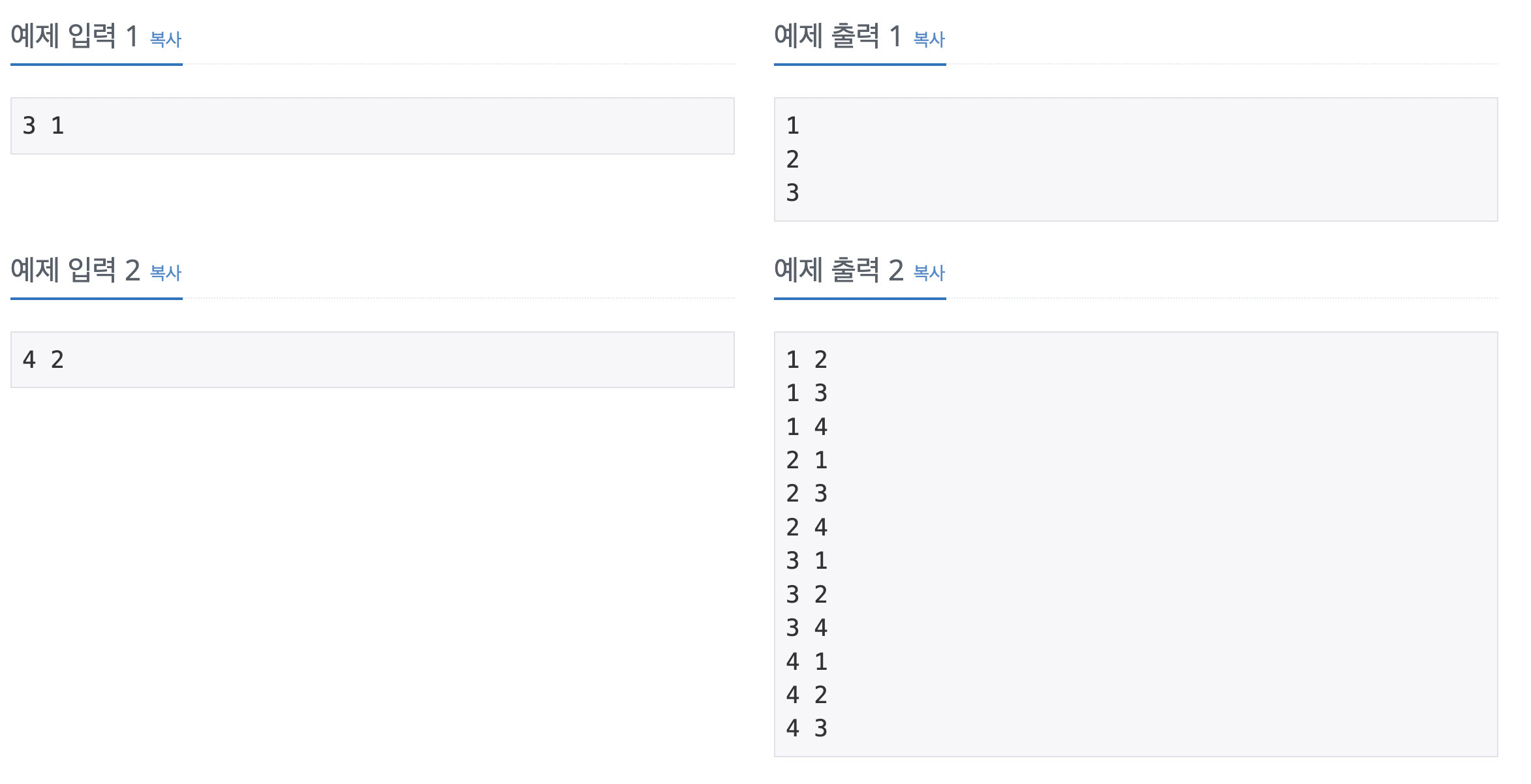첫째 줄에 자연수 N과 M이 주어진다. (1 ≤ M ≤ N ≤ 8)