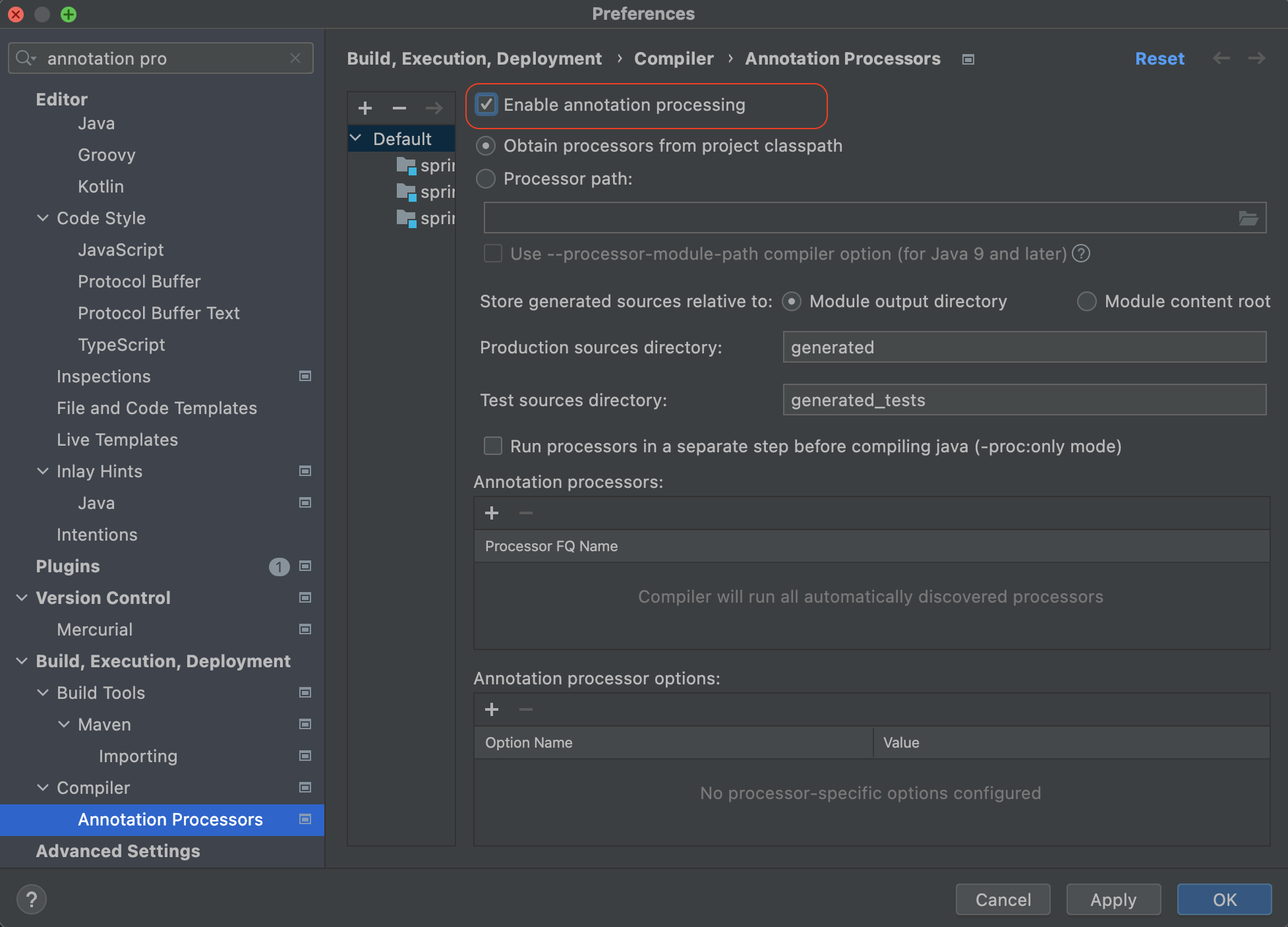Enable annotation processing 체크를 한 뒤 OK를 눌러준다.