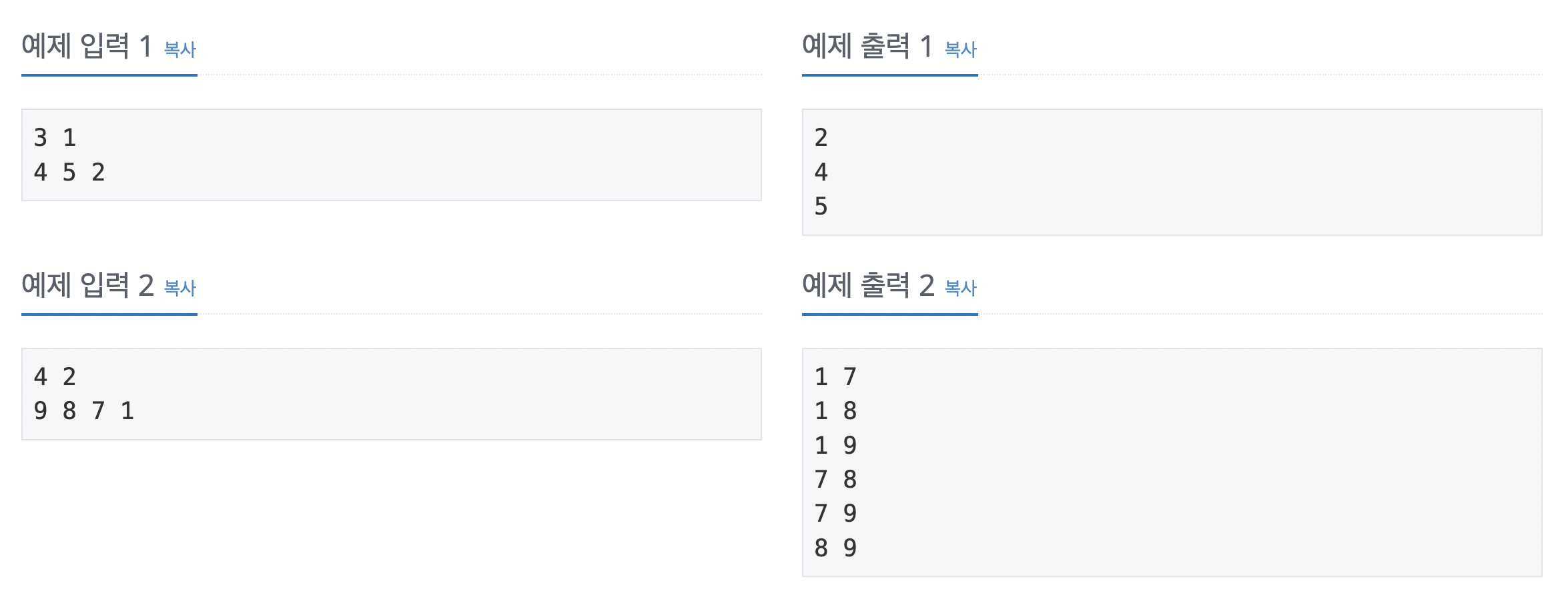 첫째 줄에 N과 M이 주어진다. (1 ≤ M ≤ N ≤ 8)
