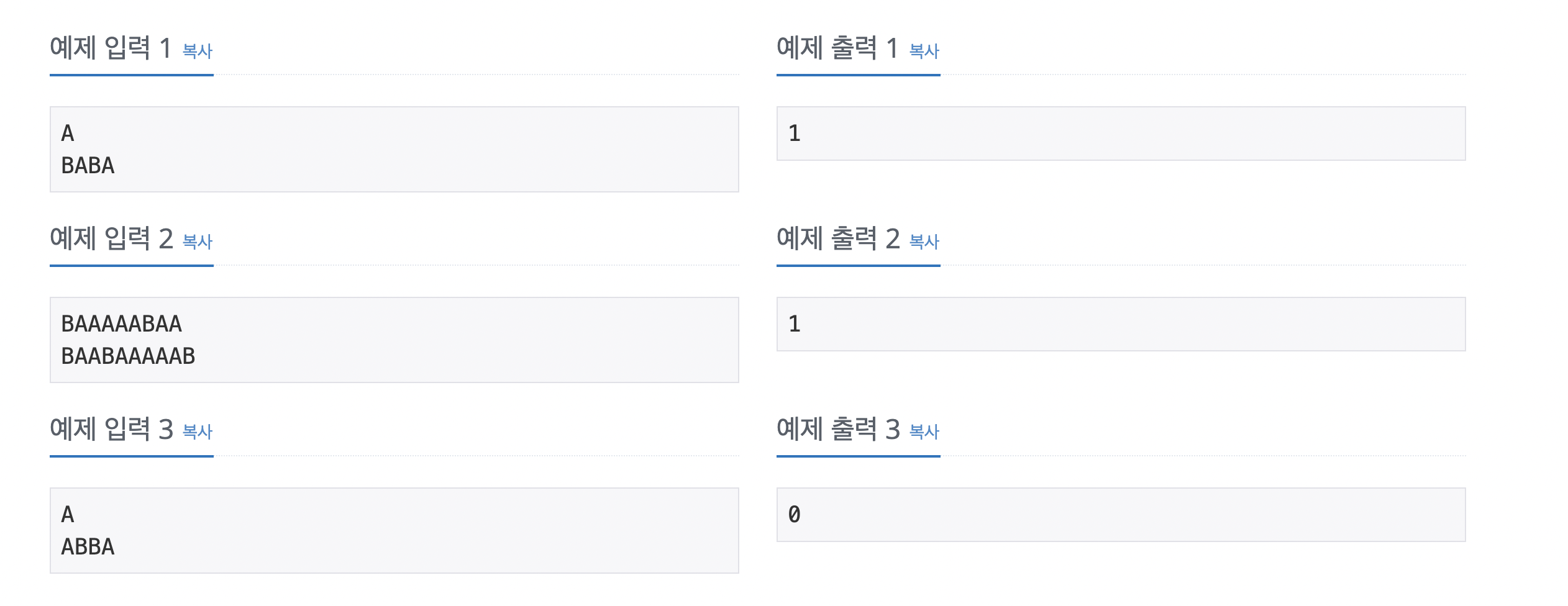 수빈이는 A와 B로만 이루어진 영어 단어 존재한다는 사실에 놀랐다. 대표적인 예로 AB (Abdominal의 약자), BAA (양의 울음 소리), AA (용암의 종류), ABBA (스웨덴 팝 그룹)이 있다.