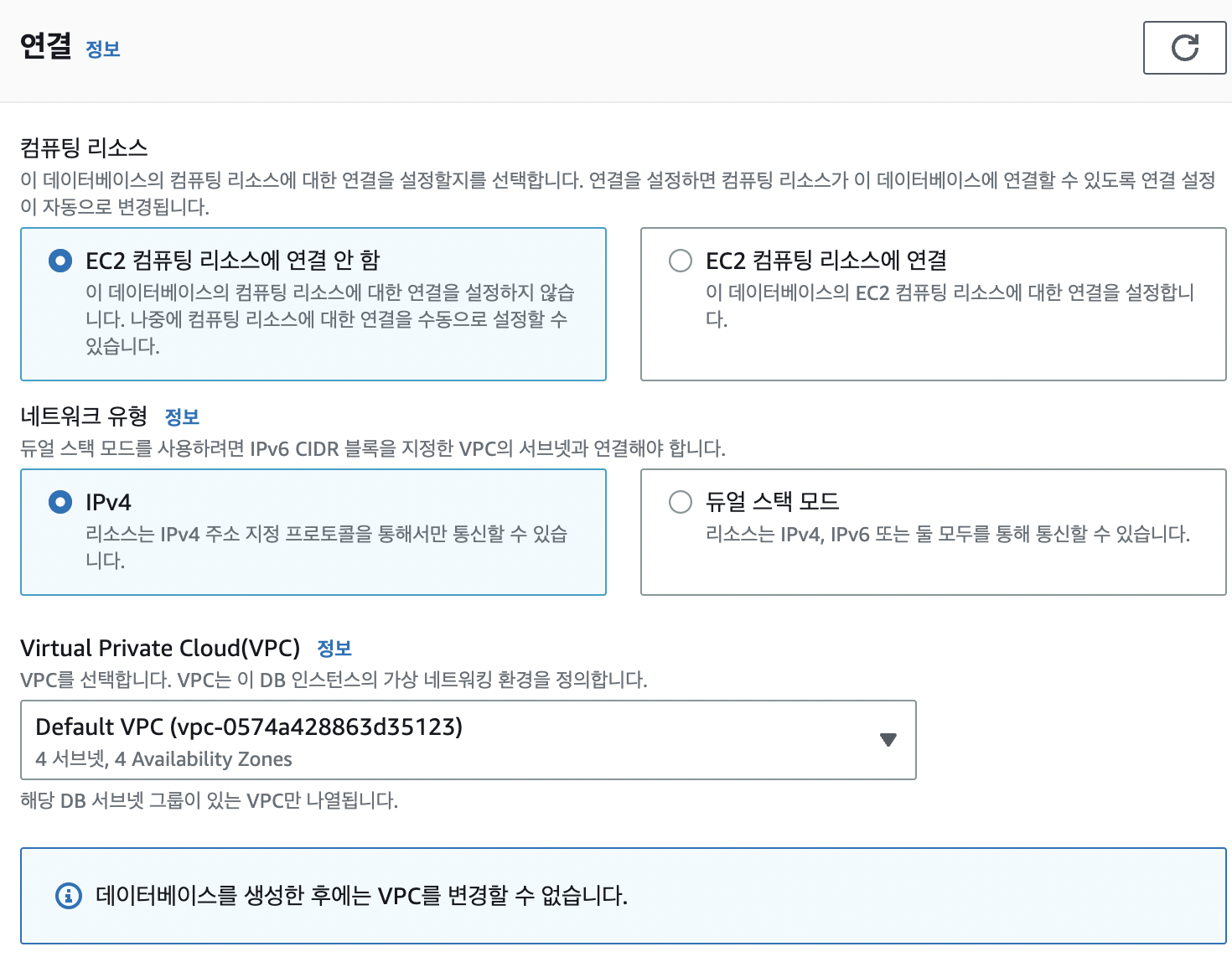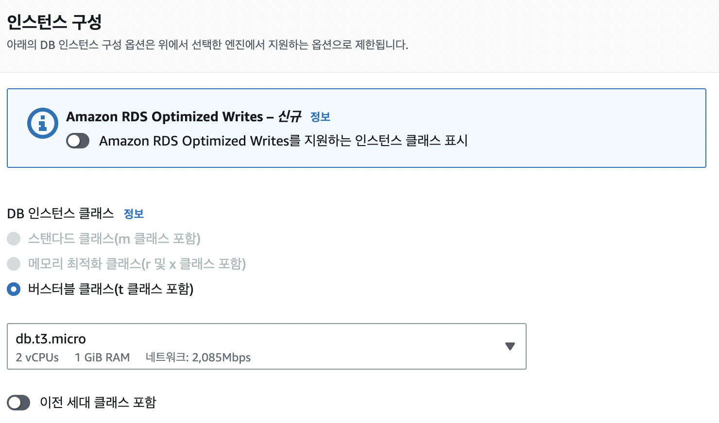 어차피 프리티어라 몇개 못쓴다.... 좀 더 성능 좋은걸 쓰고싶다면 db.t4g.micro 선택