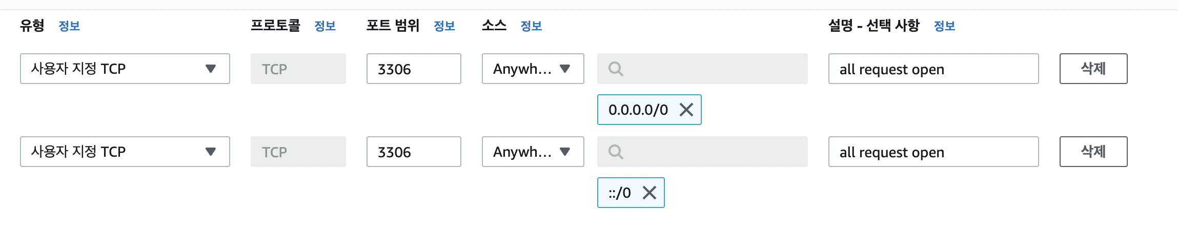 IP 관계없이 모두 3306 포트에 접근할 수 있도록 열어 준다.