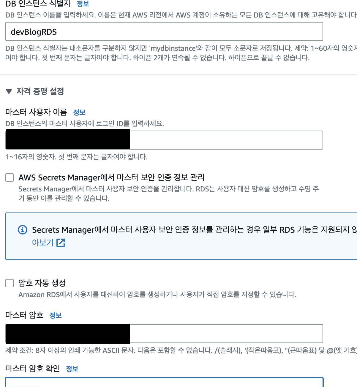 마스터 사용자 이름 : DB의 root 권한을 가진 ID