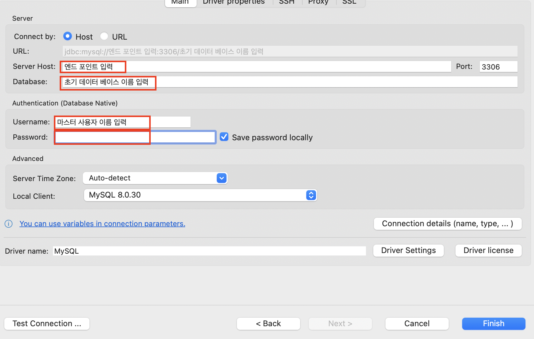 Database : 초기 데이트 베이스 이름 입력 (데이터 베이스 식별자 아님)
