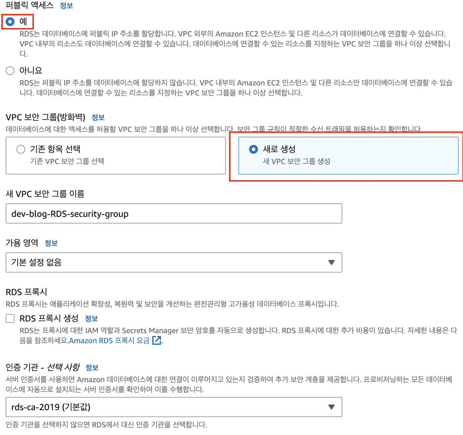 추가 구성 설정 및 RDS 생성
